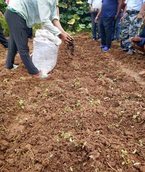 來(lái)到田間陽(yáng)光豐盛,剛翻新的土地上,散落著零星野草,陽(yáng)光一照便散發(fā)出泥土的芬芳,皮膚黝黑的農(nóng)人喜氣洋洋,熱情的歡迎著我們的到來(lái),趙經(jīng)理立馬接過(guò)鋤頭,親自示范,動(dòng)作行云流暢,十分嫻熟,他根據(jù)山地的走勢(shì),選擇出開廂方向,很快就平好一廂地。他蹲在濕潤(rùn)的土地上,鞋上沾滿了自然的饋贈(zèng),真是十分接地氣!很快,他就在平好的土地上刨出間距20~25cm的小坑,一邊行動(dòng)一邊講解,一氣呵成,一套動(dòng)作下來(lái),便已經(jīng)大汗淋漓了,村民們已經(jīng)備好了上好且成熟的農(nóng)家肥,“每個(gè)小坑播種3到5顆種子,在這之前可以先施肥,但是要刨土稍微覆蓋一下,避免發(fā)酵灼燒了種子,接下來(lái)播種3到5粒,再將土完全覆蓋,種子出芽的這段時(shí)間必須注重田間除草,眾所周知野草頑強(qiáng)的生命和驚人的長(zhǎng)勢(shì),前期必定會(huì)蓋過(guò)木香出苗,這段時(shí)間尤為重要,如果發(fā)現(xiàn)有的小坑少出或不出,就將多出的進(jìn)行移栽,此方法可保證日后的產(chǎn)出……”事無(wú)巨細(xì),娓娓道來(lái)。最后便以“做過(guò)農(nóng)民的都應(yīng)該知道!”為總結(jié)。村民們豁然開朗,紛紛表示一定沒(méi)有問(wèn)題,于是躍躍欲試,紛紛提出親自勞動(dòng),果然立馬上手!